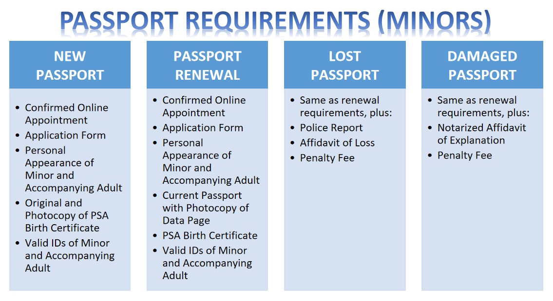 For minors, the basic requirements for getting a passport are listed below. The list varies slightly for new passport applications, passport renewal, and replacement of lost or damaged passports.